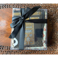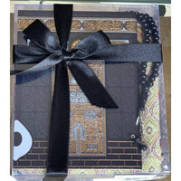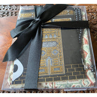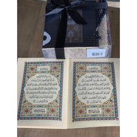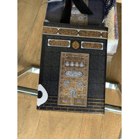 A beautifully decorated prayer mat with an elegant Surah Book in Kaba door model print along with a beautiful 99 beads tasbeeh gift packed and tied with a luxury ribbon.
