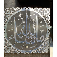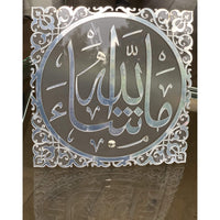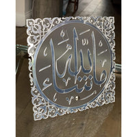A stunning gift for your friends and family, Masha Allah in cut work design on acrylic plate, comes with a stand for support. Letters look black in some photos but it's just reflection, they are silver in colour.