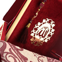 Behold a testament to the beauty of Islamic devotion with our Sacred Reflections set. At the heart of this collection lies a plush, velvet-clad Quran box, available in rich shades of dark red, bold turquoise, emerald green, and delicate pink, each adorned with the intricate golden calligraphy of Allah. Inside, it cradles a lustrous satin prayer mat, elegantly designed to inspire tranquility in your moments of reflection. Complementing the ensemble is a delicate tasbih, with pearls like beads that glisten as they glide through your fingers in meditation. This set, which merges the grandeur of tradition with a touch of modern grace, is designed to enrich your spiritual routine and serve as a precious heirloom for generations to come.