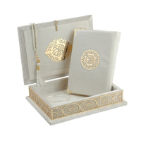 Upon opening the magnetic clasp, you will find a beautifully bound Quran, its cover echoing the design of the box for a harmonious aesthetic. Accompanied by a color-coordinated tasbih with a tassel that complements the set, this makes for a thoughtful gift or a cherished keepsake.