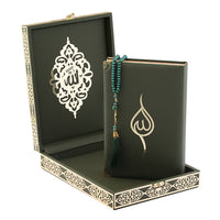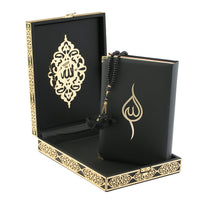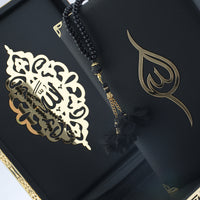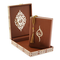 ZANBEAL Quran Box set secures the sacred Quran, with a matching leather cover that carries the same golden calligraphy. It is accompanied by the tasbih, a delicate prayer bead strand, with toned beads and gold accents. This set is more than a functional item; it is a piece of art that celebrates the Islamic faith. Perfect for daily recitations and a stately addition to any home.